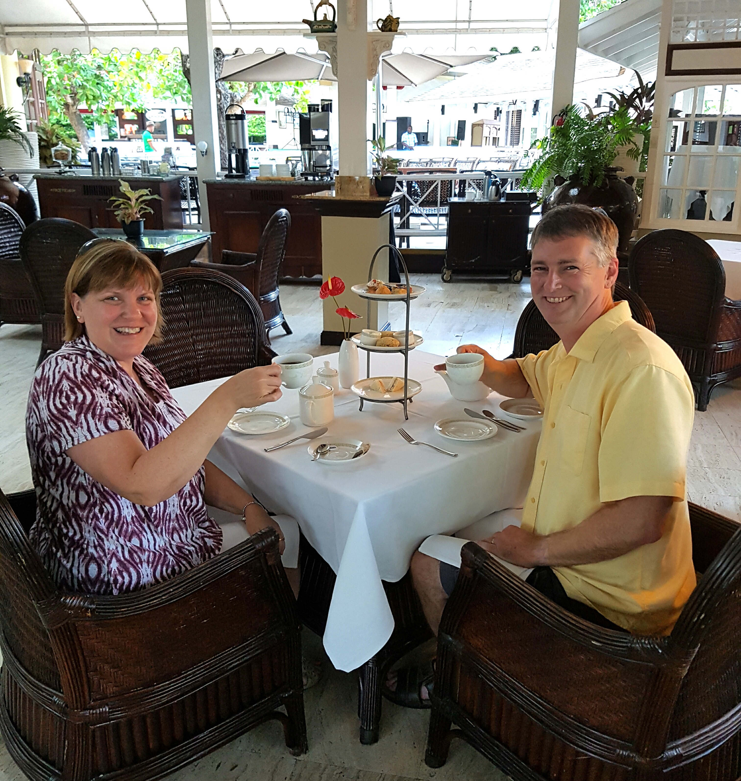 The day rolled lazily along and just after 4pm we remembered that the resort does a tea service every afternoon, so we decided to try it out. It’s a very nicely done affair, with individual tea pots for a variety of teas, a tiered serving stand with the traditional crustless sandwiches and sweets, and excellent service. The tea was held in a covered section of the resort but completely open to the outdoors so a pleasant light breeze came through as we ate and drank.