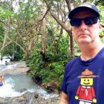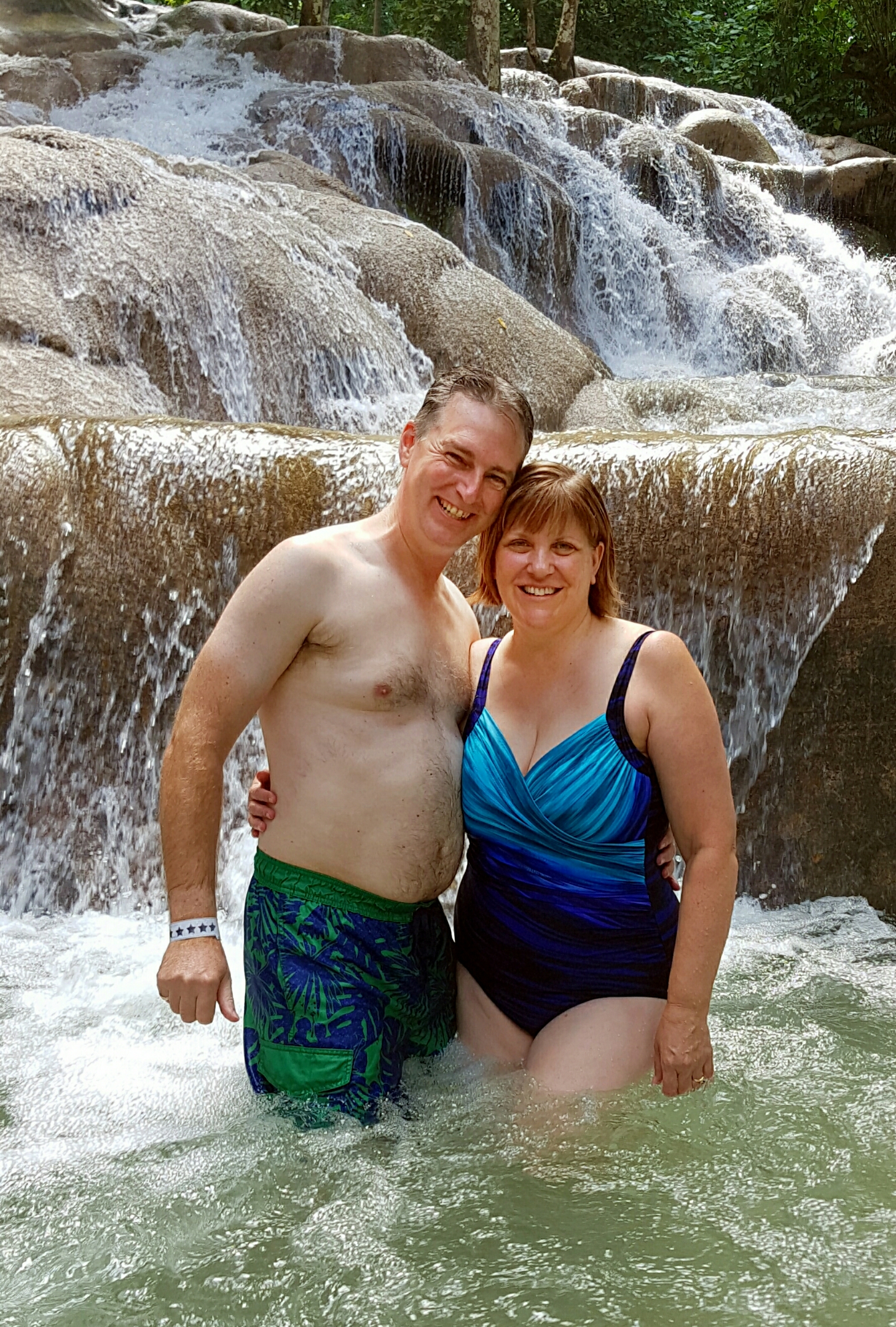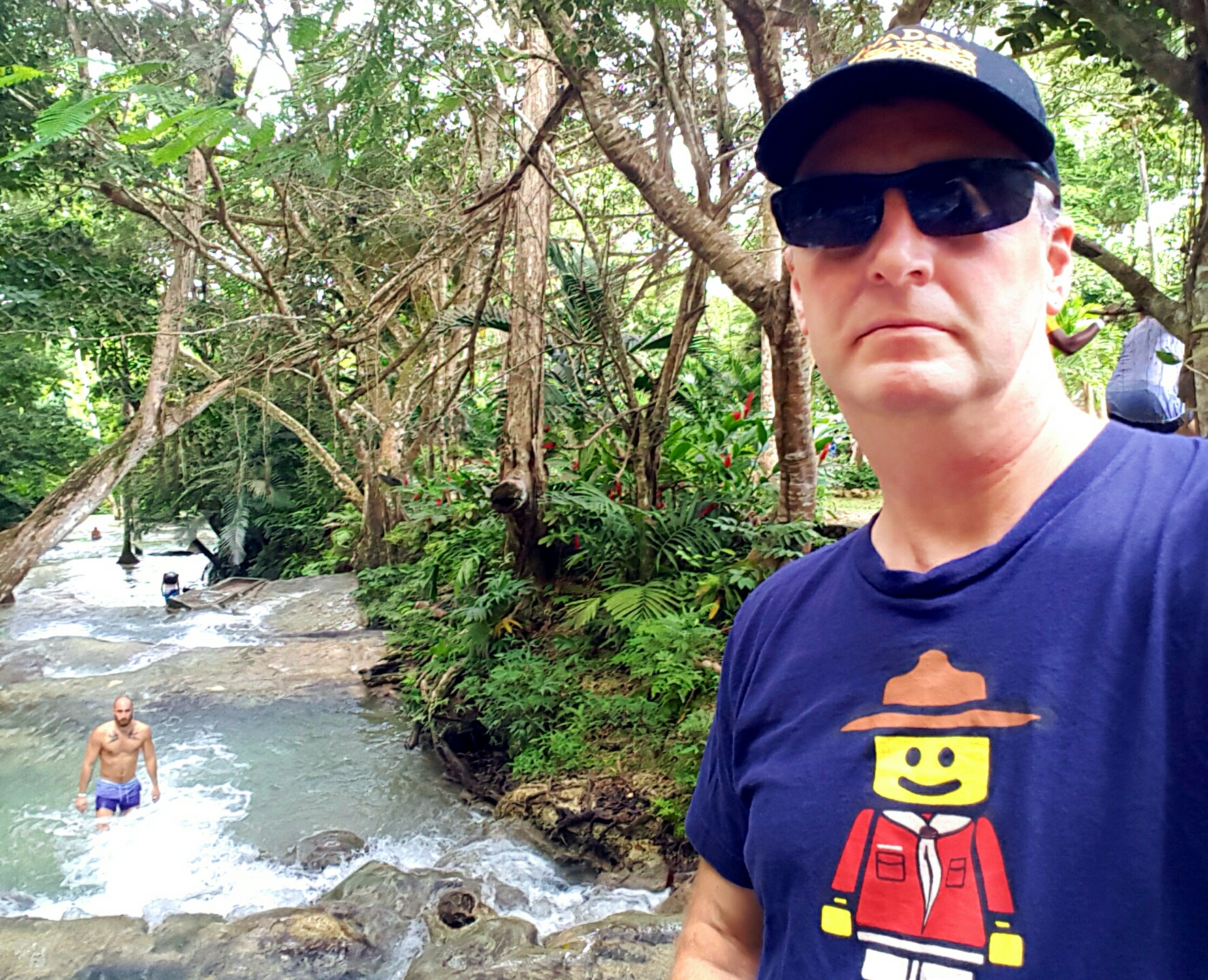At the top of the falls there are signs (Congratulations! “You have completed the climb…) and opportunities to take photos, so after donning one of my Scout themed t-shirts I took a selfie and counted it as a expedition hike ( ⚜ 🙂 ). Then we found our towels and some dry clothes and got ready to go. As we left we were herded through a colourful if somewhat aggressive mini-bazaar of souvenirs and local crafts before finding Finley again, waiting for us near the entrance. We returned to Montego Bay along a reverse route from this morning, happily dried out and sunny again.